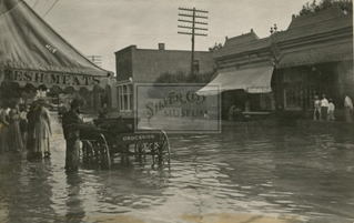 A view of a flood on Bullard Street looking northeast and showing the buildings along the east side of Bullard Street, Silver City, NM. Buildings visible include the James Corbin building and the grocery store of E.M. Young. Circa 1910. From the collection of the Silver City Museum.